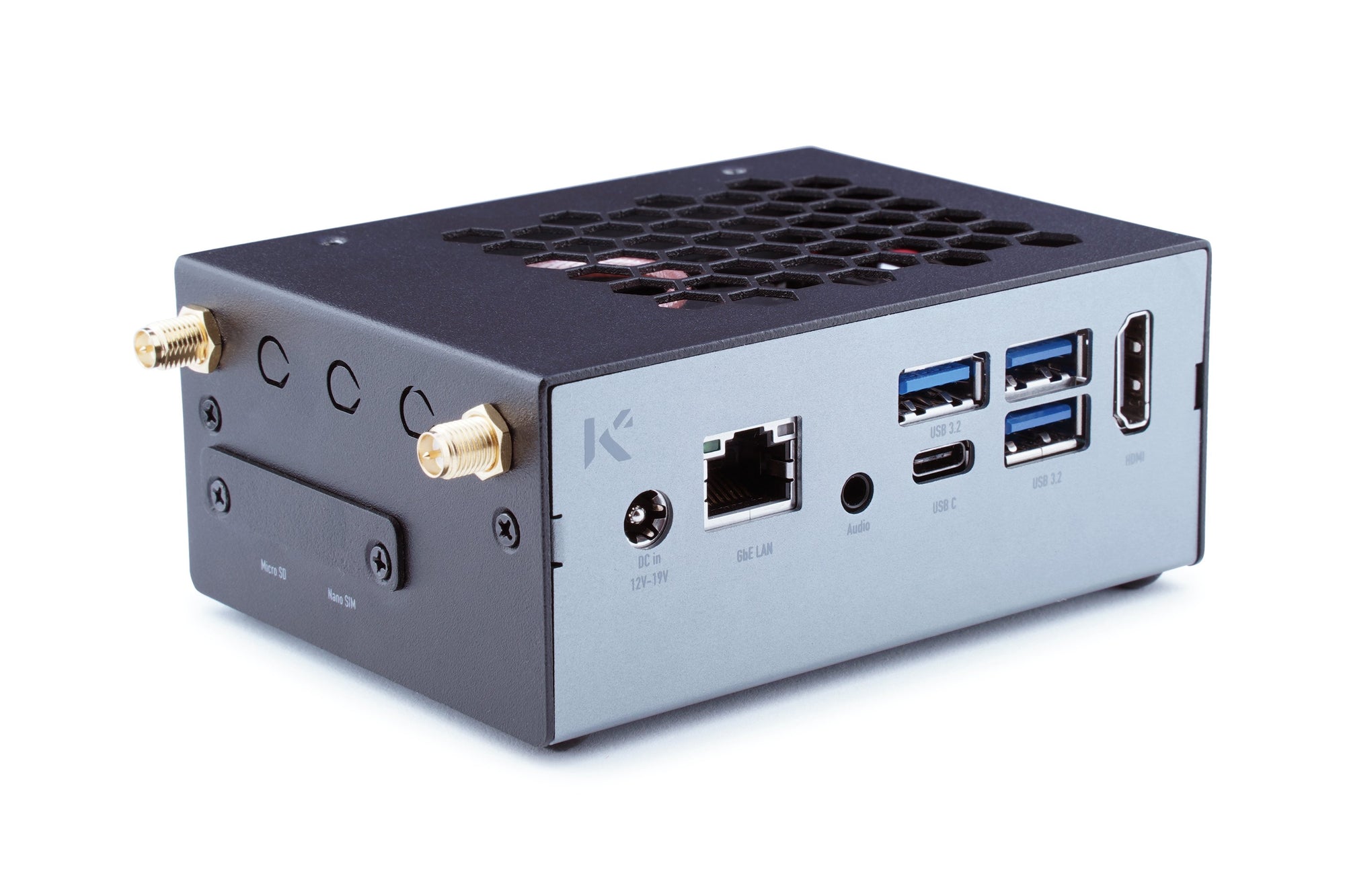 The top of this Tinker Edge R enclosure has hexagonal holes for optimized airflow to support heat dissipation. The case has cutouts to access most of the interfaces and ports on the board so that there remains no need to remove the lid while you are working on your creative projects.